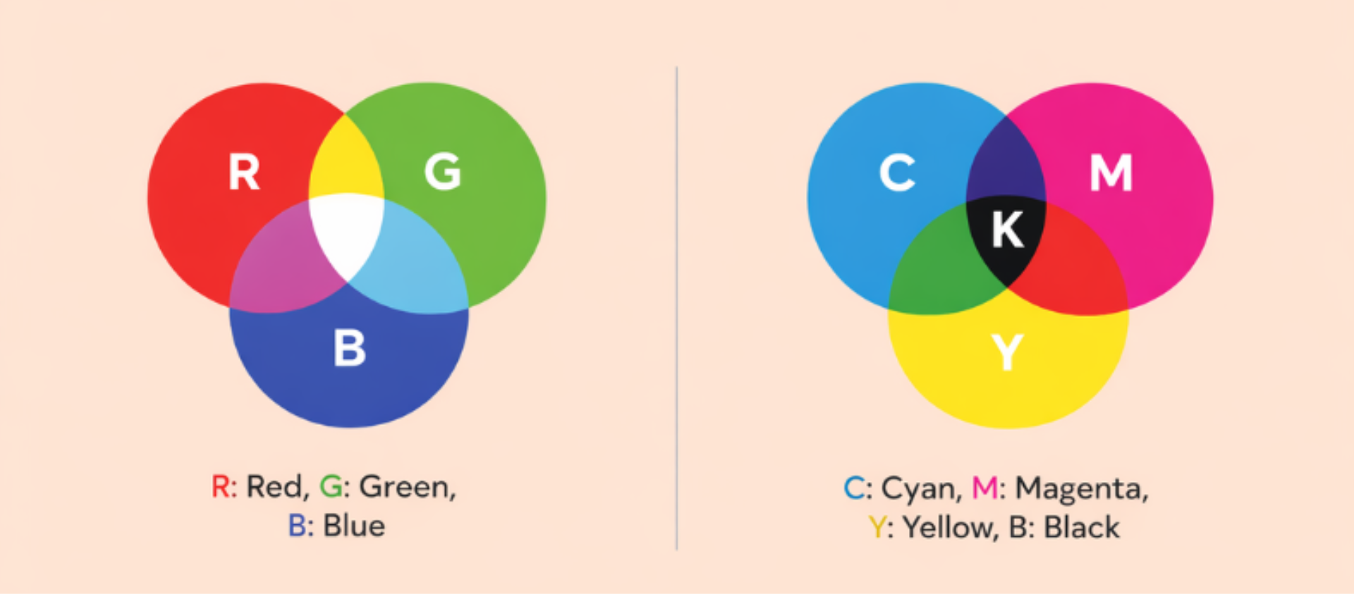 Dizainai, skirti ekranams, turėtų būti kuriami RGB formatu, kad spalvos būtų ryškios ir tiksliai atvaizduojamos skaitmeniniuose įrenginiuose. Tuo tarpu dizainai, skirti spausdinimui, turi būti paruošti CMYK formatu, kad būtų užtikrintas prognozuojamas ir tikslus galutinis rezultatas.