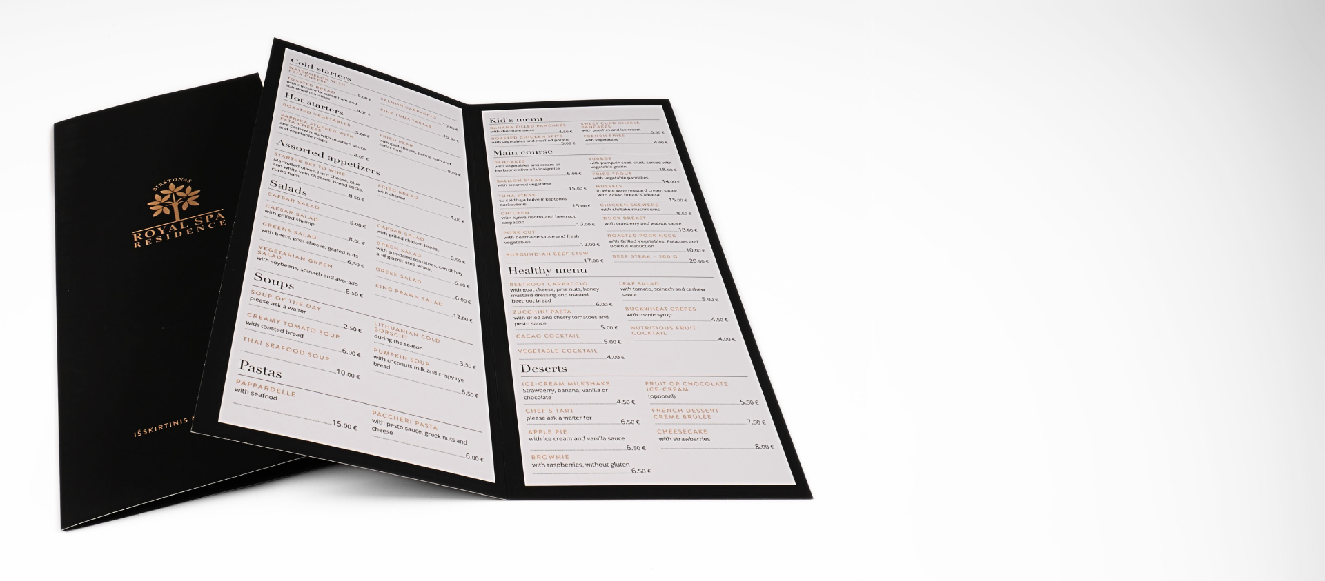 - Spausdinimo formatai ir lankstumas. Gaminame skirtingų formatų meniu, taip pat galite rinktis meniu gamybą su lenkimu ar vieno lapo meniu;