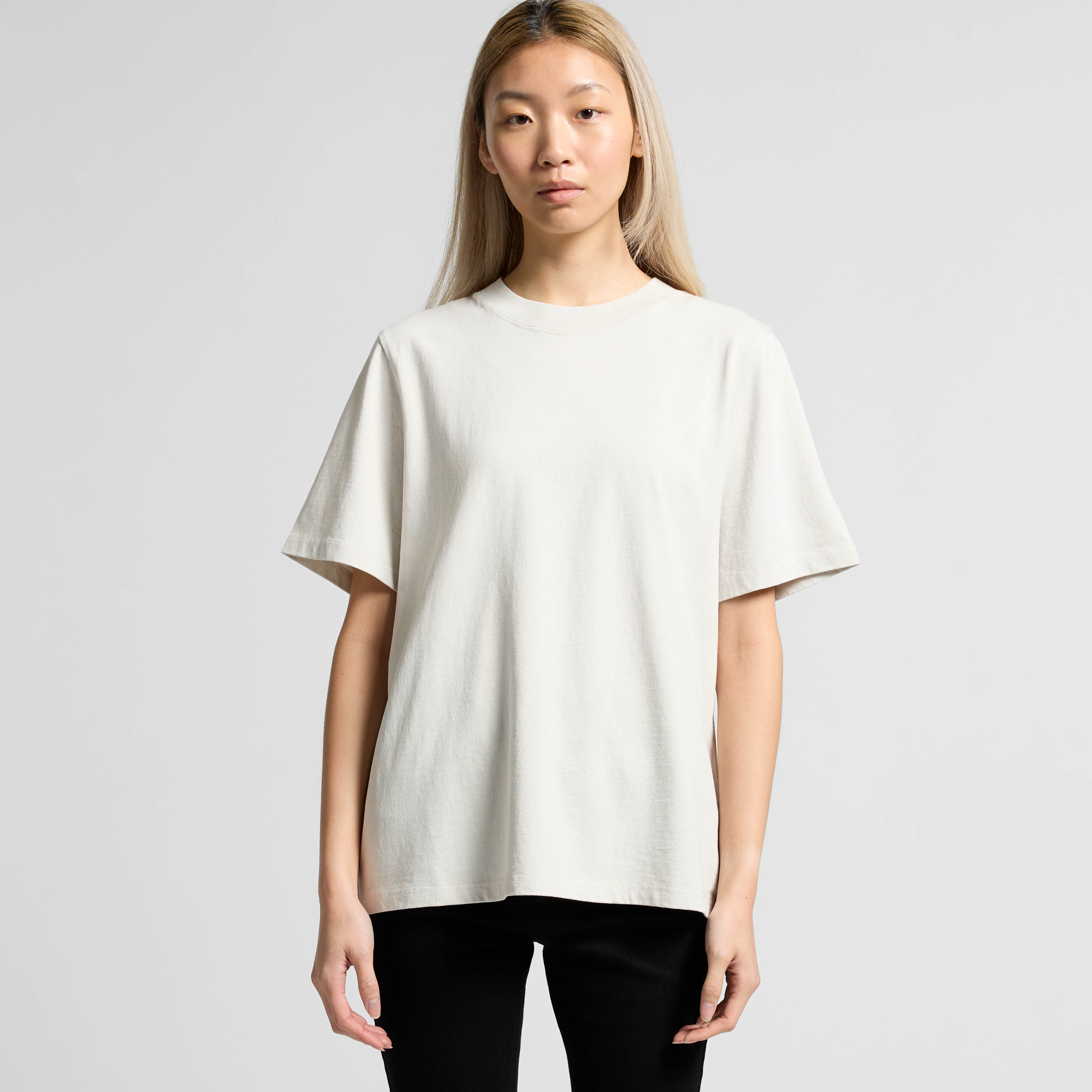 - Konstrukcija: Plati briaunota kaklo juosta, dažyta pasiuvus gaminį (garment dyed), šoninės siūlės, sutvirtinimo juosta nuo peties iki peties, dvigubos siūlės rankovių ir apačios kraštuose.